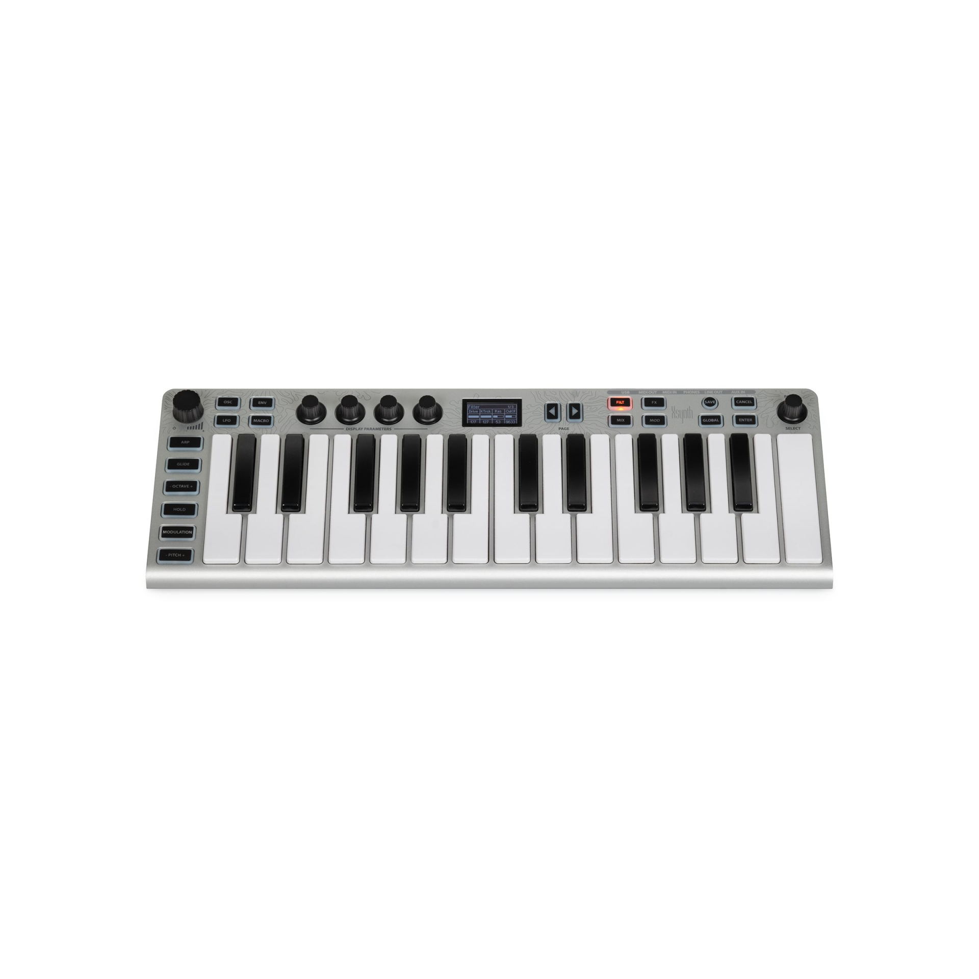 Das integrierte Audio-Interface (24-Bit/96 kHz) mit Line-Out, Aux-In und Kopfhörerausgang ermöglicht direkte Aufnahme und Wiedergabe ohne zusätzliche Hardware. USB-C Audio & MIDI sowie klassische MIDI-Ein- und Ausgänge sorgen für nahtlose Integration in jedes Studio-Setup. Der druckempfindliche Modulations- und Pitchbend-Taster, Arpeggiator, Glide-Funktion und Octave-Shift machen den Xsynth zu einem flexiblen Performance-Instrument.